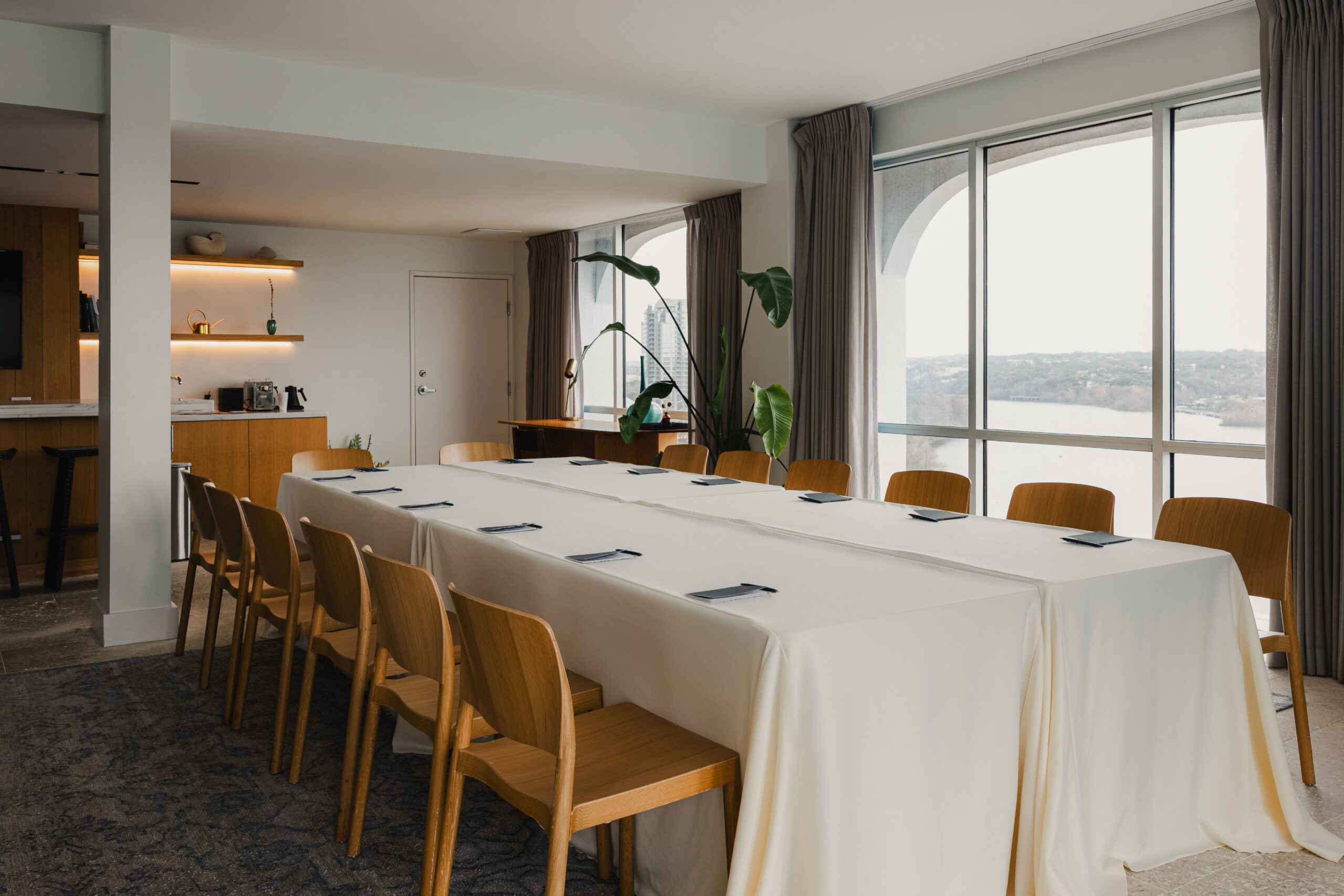 Overlooking Downtown, Travertine offers fresh inspiration and a flexible layout for a variety of business and social gatherings in Austin for up to 24 people. Adorned with original artwork, the space paints a vibrant and beautiful setting, bringing a new approach to the traditional boardroom setup.