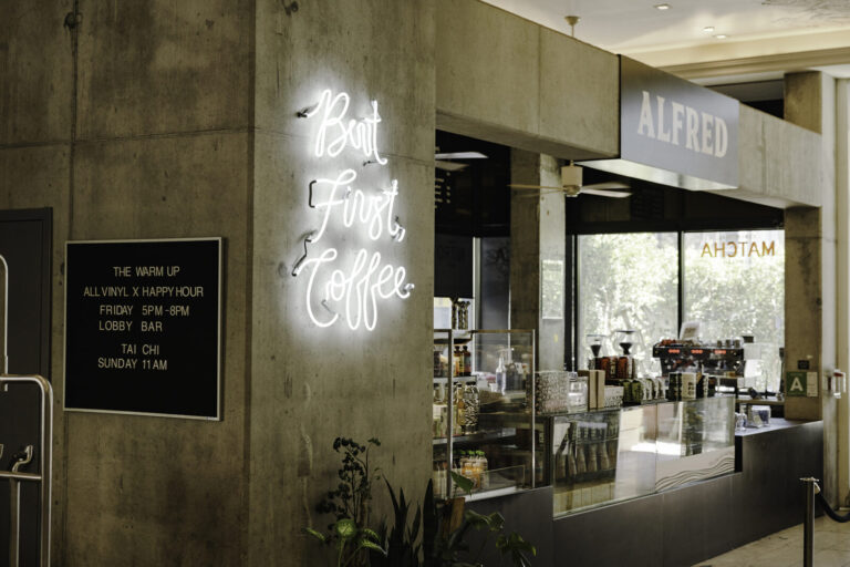 Koreatown locals and out-of-town visitors alike converge in the lobby at Alfred, LA’s most beloved coffee and matcha shop. Drop by for a wake-up cup or easy takeaway food, plus high-speed Wi-Fi and indoor and outdoor seating.