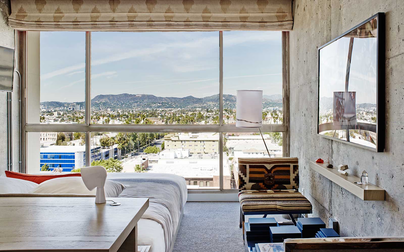 We have a variety of rooms, studios, and suites with either a king bed or double beds and views of either the Hollywood Hills or the city. ADA-accessible rooms and suites are also available and are equipped with a roll-in or transfer shower, toilet with grab bars, lower vanity, visual alarm, and notification devices.